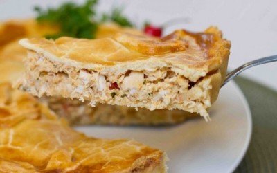 Embrulhe em papel filme e leve a geladeira por aproximadamente 30 minutos. Use metade da massa para forrar a assadeira e a outra para cobrir o recheio, pincele o empadão com a gema.