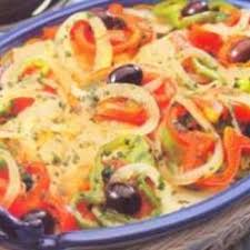 Aqueça metade do azeite em uma panela, em fogo médio e refogue o pimentão e a cebola por 3 minutos. Acrescente o bacalhau, a batata, o tomate e tempere com sal e pimenta.