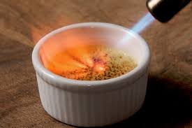 Coloque açúcar cristal sobre cada tigela e aqueça para formar o caramelo, o ideal é usar um maçarico culinário para dar a consistência ideal do Crème Brulée.