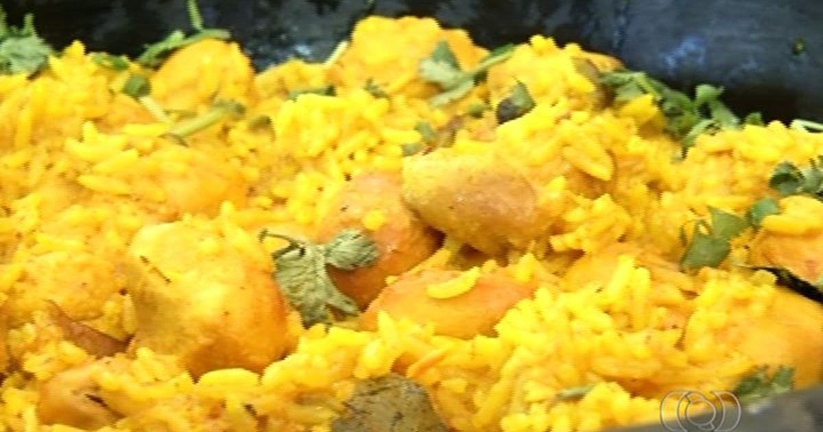 1- Tempere os pedaços do frango com sal e pimenta-do-reino. Numa panela grande, coloque um pouco de óleo, o alho amassado e o açafrão. Dissolva-os. Acrescente os pedados do frango. Mexa até dourar.