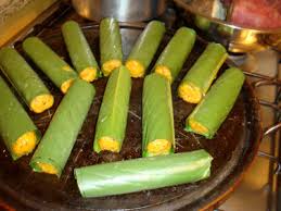 Cortar cada folha de bananeira em quatro partes. Em cada uma, colocar duas colheres (sopa) da massa e enrolar. Levar ao forno na temperatura de 200 graus, por 30 minutos.
