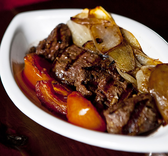 Em uma vasilha, coloque os cubos de carne e o vinho. Deixe marinar por 8 horas. Em uma panela com o óleo, refogue as cebolas, o alho e o gengibre.
