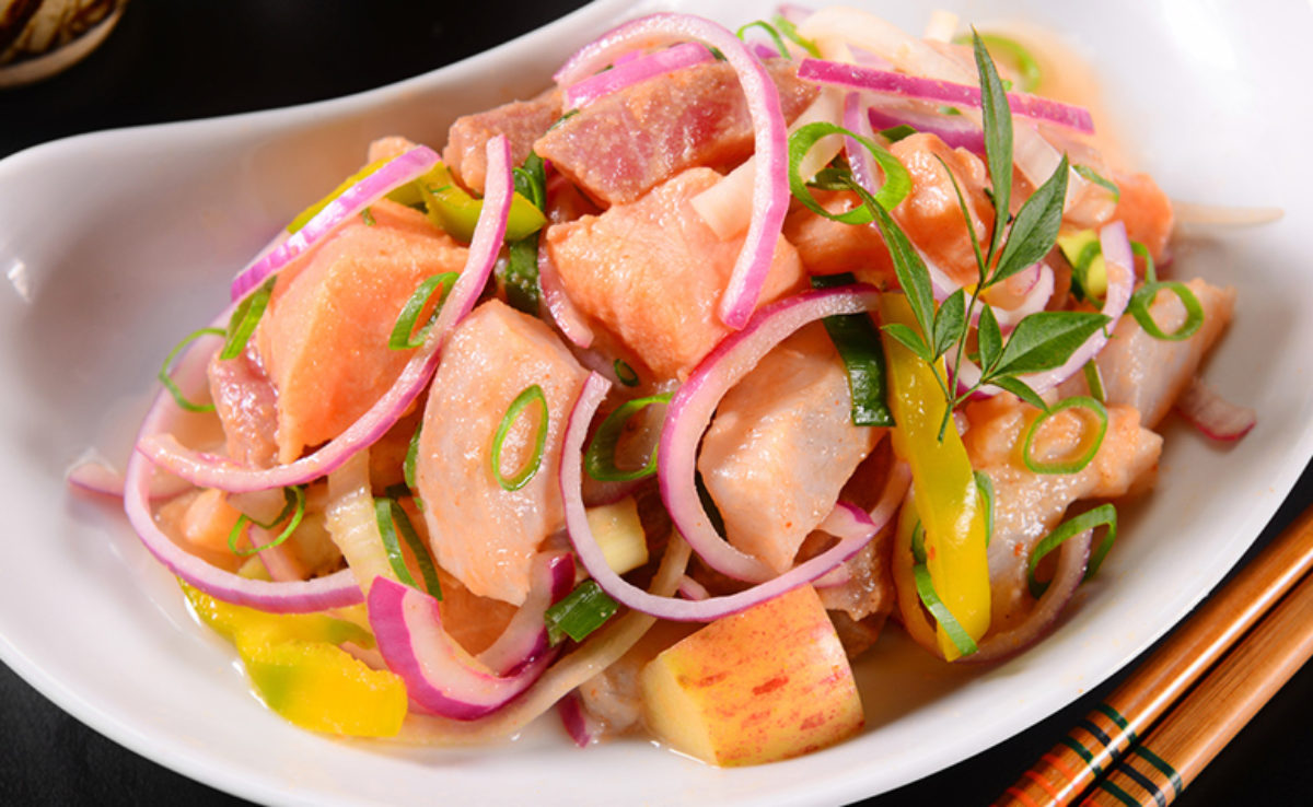 Corte o salmão em cubos, coloque em um bowl com o suco de limão, a cebola, a salsinha, o coentro e a pimenta. Tampe e coloque na geladeira para pegar o salmão pegar o gosto do tempero e ficar levemente cozido.